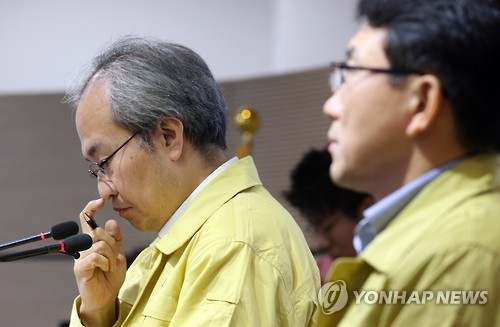 | △ '고심' (세종=연합뉴스) 배재만 기자 = 권준욱 중앙메르스관리대책본부 기획총괄반장(왼쪽)이 16일 오전 정부세종청사 보건복지부 공용브리핑룸에서 열린 중동호흡기증후군(메르스) 정례 브리핑에서 메르스 환자 현황에 대한 기자들의 질문에 답하던 중 잠시 생각에 잠겨 있다. 오른쪽은 권덕철 총괄반장. 2015.6.16 scoop@yna.co.kr http://blog.yonhapnews.co.kr/f6464 |