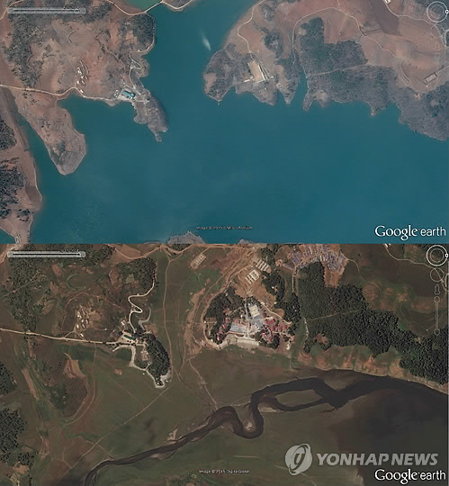 | △ 극심한 가뭄으로 말라버린 북한 연풍호 (서울 구글=연합뉴스) 극심한 가뭄으로 북한 평안남도 개천시 연풍호가 메마른 모습이다. 연풍호에는 북한이 최신 시설을 갖춘 과학자 전용 휴양지로 자랑하는 연풍과학자휴양소가 있다. 구글어스 위성사진을 보면 연풍호의 2014년 4월 사진(위)은 물이 가득 차 있지만 아래 사진은 가뭄으로 물이 말라버린 모습이 확인된다. |