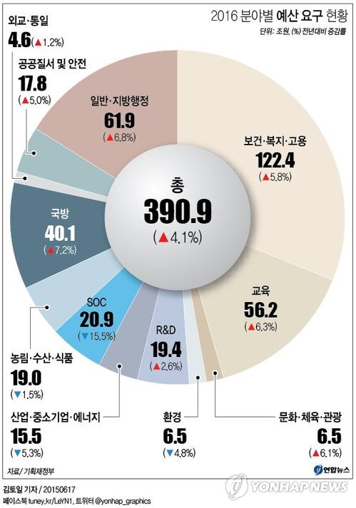 기획재정부는 17일 각 부처로부터 받은 2016년도 예산·기금의 총지출 요구 규모가 390조9천억원으로 올해 예산보다 15조5천억원(4.1%) 증가했다고 밝혔다.