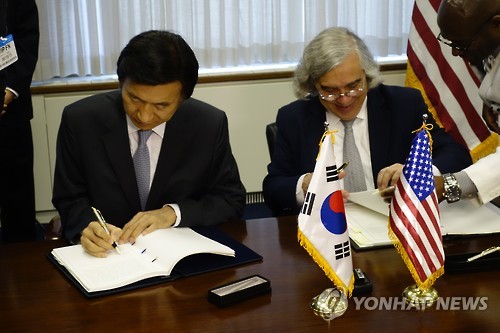 | △ 개정 한미 원자력협정에 서명하는 윤병세 외교장관 (워싱턴=연합뉴스) 김세진 특파원 = 윤병세 외교장관(왼쪽)과 어니스트 모니즈 미국 에너지부 장관이 15일(현지시간) 미국 워싱턴DC 에너지부 본부에서 개정된 한미 원자력협정문에 서명하고 있다. |