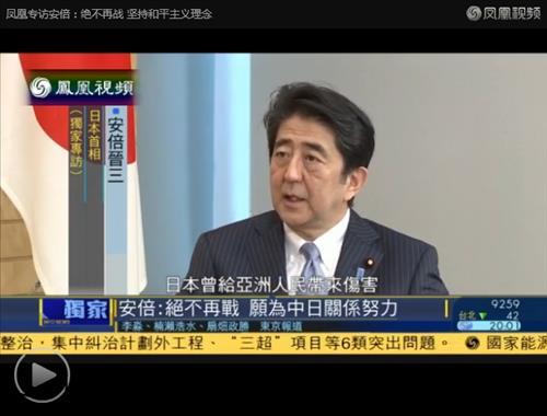 아베 총리는 전날 홍콩 봉황(鳳凰)위성TV와 한 인터뷰에서 "일본은 절대로 70년 전 전쟁의 전철을 다시 밟지 않을 것이다. 우리는 이미 다시는 전쟁을 하지 않는다고 선언했다"고 말했다.