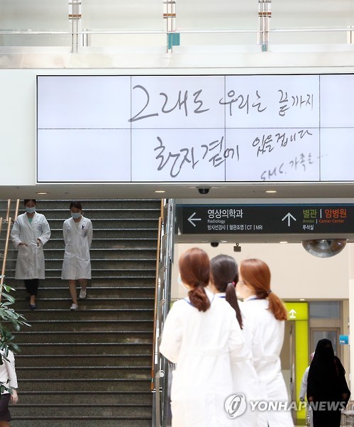 | △ 그래도 우리는 끝까지 환자 곁에 (서울=연합뉴스) 홍해인 기자 = 12일 서울 일원동 삼성서울병원 로비의 전광판에 "그래도 우리는 끝까지 환자 곁에 있겠습니다"라는 손글씨 메모가 전광판에 게시된 가운데 의료진들이 마스크를 쓴 채 오가고 있다. 이 글은 지난 10일 삼성서울병원 간호사 식당게시판에 올라왔던 글로 언론을 통해 소개되면서 보는 이들의 마음을 뭉클하게 했다. 2015.6.12 hihong@yna.co.kr |