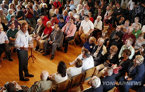 | △ (데리<미 뉴햄프셔> AP=연합뉴스) 미국 공화당 대통령선거 후보인 젭 부시 전 플로리다 주지사가 16일(현지시각) 뉴햄프셔 주 데리 오페라하우스에서 유권자들에게 연설하고 있다. 미국에서는 뉴햄프셔 주에서 가장 먼저 대통령 예비선거를 치른다. |