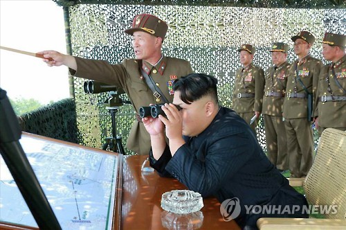 | △ 북한 김정은, 고사포병 사격경기 참관 (서울=연합뉴스) 김정은 북한 국방위원회 제1위원장이 인민군 항공 및 반항공군, 호위사령부인 제963대연합부대와 3군단으로 알려진 제526대연합부대 산하 고사포병 중대, 고사포병 군관학교 교원과 학생으로 편성된 중대들이 참가한 고사포병 사격경기를 참관했다고 노동신문이 18일 보도했다. 김정은 제1위원장이 쌍안경으로 경기를 지켜보고 있다. 2015.6.18 nkphoto@yna.co.kr |