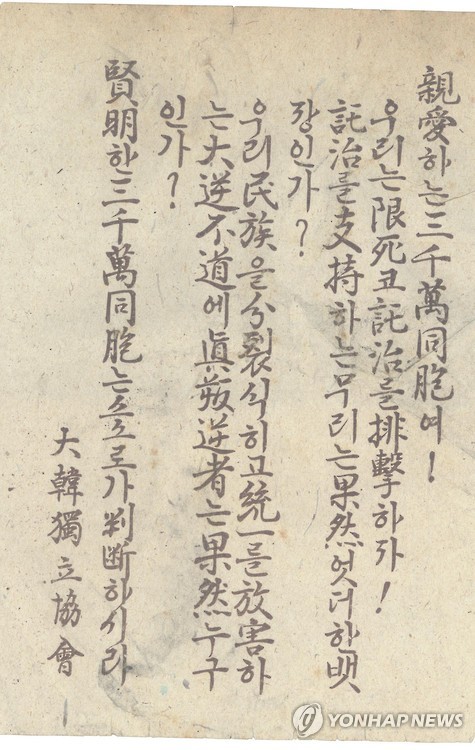 | △ <광복 70년> 아직도 골깊은 이념 지평…진보vs보수의 평행선 (서울=연합뉴스) 광복 직후 한반도는 '동서냉전의 축소판'이었다. 광복과 동시에 분단이라는 운명에 처한 우리나라는 1945년 12월 미국, 소련, 영국이 모스크바 삼상회의를 열고 미소공동위원회를 구성해 한국에 임시정부를 세운 뒤 4년간의 신탁통치를 거쳐 완전독립을 허용한다는 내용의 모스크바 의정서를 맺자 강경한 반탁운동이 벌어졌다. 좌익은 '민주주의민족전선'을 결성해 신탁통치를 이끌려 했고, 이에 맞서 이승만과 김구가 이끄는 우익은 '비상국민회의'를 조직해 신탁통치에 저항했다.사진은 1946년 신탁통치 반대를 촉구하는 대한독립협회의 격문. << 연합뉴스DB >> |