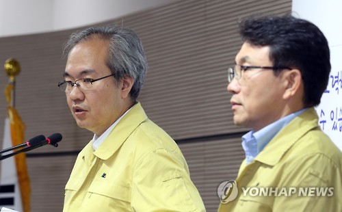 | △ '메르스 환자 현황은' (세종=연합뉴스) 배재만 기자 = 권준욱 중앙메르스관리대책본부 기획총괄반장(왼쪽)이 17일 오전 정부세종청사 보건복지부 공용브리핑룸에서 열린 중동호흡기증후군(메르스) 정례 브리핑에서 메르스 환자 현황에 대한 기자들의 질문에 답하고 있다. 오른쪽은 권덕철 총괄반장. 2015.6.17 scoop@yna.co.kr http://blog.yonhapnews.co.kr/f6464 |
