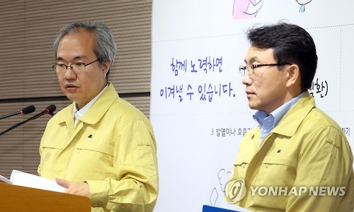 | △ '메르스 환자 현황은' (세종=연합뉴스) 배재만 기자 = 권준욱 중앙메르스관리대책본부 기획총괄반장(왼쪽)이 17일 오전 정부세종청사 보건복지부 공용브리핑룸에서 열린 중동호흡기증후군(메르스) 정례 브리핑에서 메르스 환자 현황에 대한 기자들의 질문에 답하고 있다. 오른쪽은 권덕철 총괄반장. 2015.6.17 scoop@yna.co.kr http://blog.yonhapnews.co.kr/f6464 |