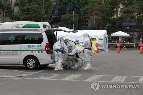 | △ 대구 메르스 환자 경북대병원 이송 (대구=연합뉴스) 대구 첫 중동호흡기증후군(메르스) 확진 환자인 공무원 A(52)씨가 집중치료를 받기 위해 17일 오후 대구의료원에서 경북대병원으로 이송됐다. 2015.6.17 << 경북대병원 >> mshan@yna.co.kr |