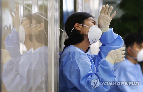 | △ 방역복을 입은 병원 관계자가 의자에 앉아 이마에 흐르는 땀을 닦고 있다 (연합뉴스 자료사진) |
