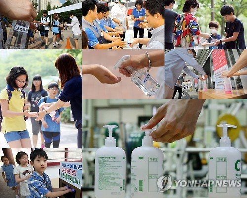 | △ 메르스 발생 한 달, 전국 곳곳은 손소독제 행렬 (서울=연합뉴스) 오는 20일이면 국내에 중동호흡기증후군(메르스) 첫 환자가 발생한지 한 달이 된다. 보건당국이 손 소독으로 메르스 감염을 크게 줄일 수 있다고 밝혔고 관공서, 교육기관, 의료시설, 회사 등의 입구에는 어김없이 손 소독제 및 세정제가 비치됐다. 소리없이 찾아온 메르스.... 이제는 온 국민이 예방수칙을 철저하게 지켜 메르스 확산을 막을 때이다. 2015.6.18 << 연합뉴스 DB >> jjaeck9@yna.co.kr |