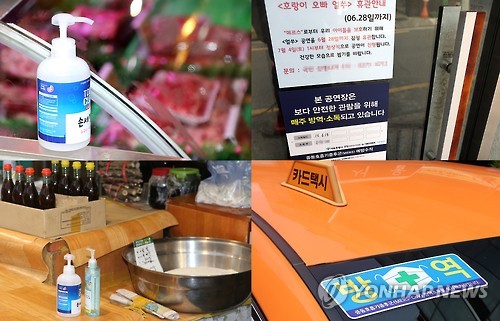 | △ (서울=연합뉴스) 최평천 기자 = 오는 20일이면 국내에 중동호흡기증후군(메르스) 첫 환자가 발생한지 한 달이 된다. 추가 감염자를 막기 위해 곳곳에서 방역·소독·휴관이 계속되고 있다. 윗줄 왼쪽부터 시계방향으로 종로구 통인시장 정육점에 놓인 손 소독제, 종로구 대학로 소극장에 걸린 휴관 안내문, 종로구 통인시장 방앗간에 놓인 손 소독제, 종로구 대학로 도로에 정차한 택시에 붙어있는 방역 스티커. 2015.6.18 trump@yna.co.kr |