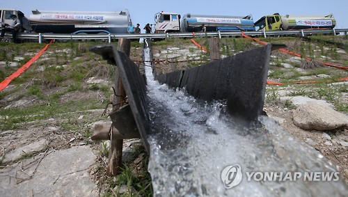 | △ 남한강 물로 마른 저수지 물 채우기 (여주=연합뉴스) 신영근 기자 = 극심한 가뭄이 계속되는 가운데 18일 오전 경기도 여주시 대신면 옥촌저수지에서 수자원공사가 남한강 물을 담은 물탱크 차량으로 바닥을 드러낸 저수지에 물을 채우고 있다. drops@yna.co.kr http://blog.yonhapnews.co.kr/geenang |