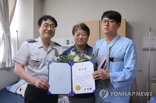 | △ 투신모녀 받아낸 시민 (광주=연합뉴스) 경기 광주경찰서는 아파트 6층에서 뛰어내린 모녀를 받아내 목숨을 구한 김민수(26·오른쪽)씨에게 감사장과 꽃다발을 전달했다고 15일 밝혔다. (경기 광주경찰서 제공) |