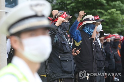 | △ '메르스 우려' 입 가린 경찰과 노조원 (울산=연합뉴스) 김용태 기자 = 19일 오후 울산시 남구 매암동 CJ대한통운 울산지사 앞에서 화물연대 전국 확대간부 결의대회가 열리는 가운데 마스크를 쓴 의경 뒤로 입을 가린 노조원들이 구호를 외치고 있다. 2015.6.19 yongtae@yna.co.kr |