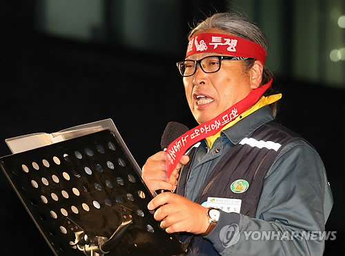| △ 투쟁사하는 정병모 현대중 노조위원장 (울산=연합뉴스) 김용태 기자 = 23일 오후 울산 현대중공업 본사에서 열린 '2015 임투 승리 출정식'에서 정병모 노조위원장이 투쟁사를 하고 있다. 2015.4.23 yongtae@yna.co.kr |