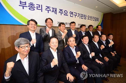 | △ 주요 연구기관장 오찬간담회 (서울=연합뉴스) 박지호 기자 = 최경환 경제부총리 겸 기획재정부 장관(앞줄 가운데)이 19일 오후 서울 태평로 프레스센터에서 열린 '주요 연구기관장 오찬간담회'에서 참석자들과 함께 기념촬영을 하고 있다. 2015.6.19 jihopark@yna.co.kr |