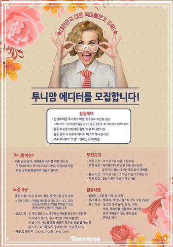 투니맘 에디터 지원 희망자는 오는 30일까지 자유 양식의 지원서와 함께 에디터로서의 역량을 보여줄 수 있는 UCC, 만화, 사진, 글 등 육아를 테마로 제작한 콘텐츠를 투니맘 공식 메일 계정(tooni_mbs@naver.com)으로 보내면 된다.