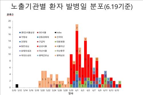 복지부가 배포한 노출기관별 환자 발병일 분포를 보면 하루 만에 환자 19명이 발생한 이달 1일을 정점으로 환자 증가세가 꺾이고 있다.