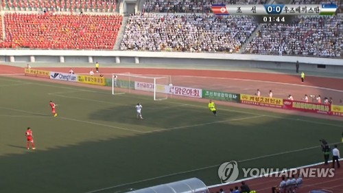 | △ 지난 16일 평양 김일성경기장에서 열린 2018 러시아 월드컵축 구대회 아시아 지역 2차 예선에서 우즈베키스탄에 4-2로 승리했다고 조선중앙TV가 같은날 보도했다. 북한은 앞서 11일 카타르 도하에서 열린 예멘과의 1차전에서도 1-0으로 승리해 현재까지 2연승을 거뒀다. 이날 조선중앙TV가 방영한 우즈베키스탄과의 경기 장면에서 개성고려인삼, 평양건재공장 등 북한 후원기업들의 광고 현수막이 경기장 외곽을 가득 둘러싼 모습이 눈에 띈다. 2015.6.21. |