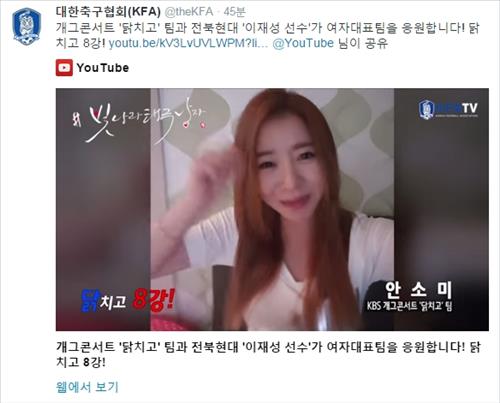 이 영상에서 개콘 안소미 씨는 "여자축구 대표팀의 8강 진출을 진심으로 응원하겠다"며 "닭치고 8강 진출 후다닥"이라고 응원 메시지를 보냈다. 닭은 프랑스의 상징이다.