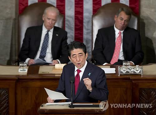 | △ 4월 29일 미국 의회에서 연설하는 아베 총리(AP.연합뉴스.자료사진) |