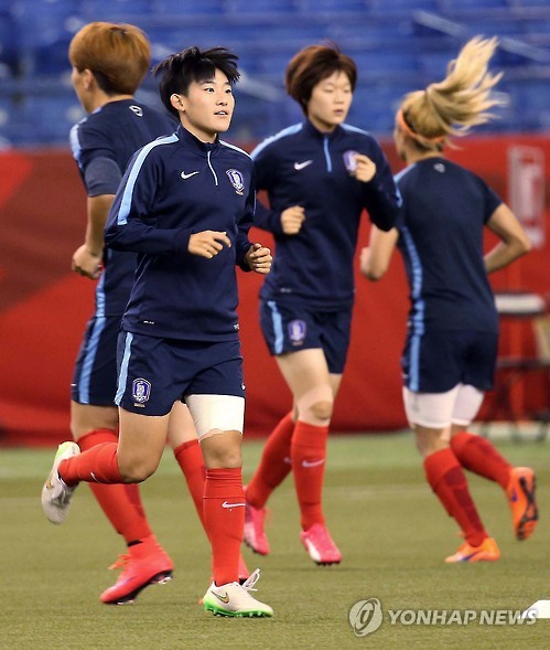 | △ '역전골'의 주인공 김수연 (몬트리올=연합뉴스) 신준희 기자 = 한국 여자축구 대표팀 김수연 등 선수들이 21일 오전(한국시간) 캐나다 몬트리올 올림픽 스타디움에서 훈련을 하고 있다. 윤 감독이 이끄는 한국 대표팀은 오는 22일 프랑스와 2015 캐나다 여자 축구 월드컵 16강전을 치른다. 2015.6.21 hama@yna.co.kr |