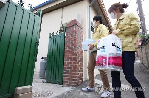 | △ 격리된 주민 집에 생필품 배달하는 옥천군청 공무원들.<<연합뉴스 DB>> |