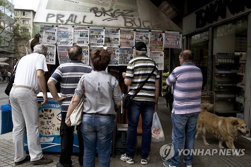 | △ 구제금융 협상전 긴장감 도는 그리스 수도 아테네. 아테네 시민들이 19일 한 신문 가판대에서 구제금융관련 보도를 살펴보고 있다.(AP=연합뉴스) |