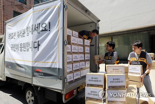 | △ KB국민은행, 메르스 극복 위한 응원물품 전달 (서울=연합뉴스) KB국민은행 직원들이 21일 오전 서울 양재동 한 사무실에서 국민안전처, 희망브리지 전국재해구호협회와 함께 중동호흡기증후군(메르스)과 사투를 벌이고 있는 의료진과 격리자를 위한 선물세트와 긴급구호세트를 만든 후 차량에 싣고 있다. KB국민은행은 이날 만든 선물세트와 긴급구호세트에 응원 메시지를 담아 6개 지역(서울, 부산, 대전, 경기도, 충청남도, 전라북도)에 전달한다고 밝혔다. << KB국민은행 제공 >> 2015.6.21 photo@yna.co.kr |