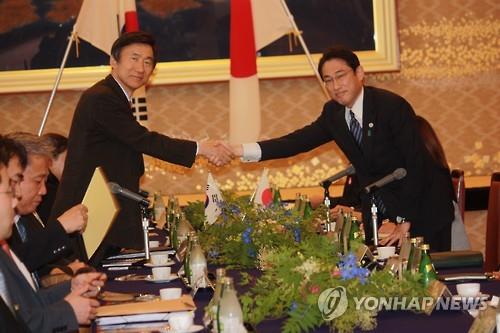 한일 외교 실무수장 자격으로 6번째 만난 윤병세 외교부 장관과 기시다 후미오(岸田文雄) 일본 외무상은 취재진 수십명 앞에서 악수하며 옅은 미소를 띠었지만 긴장감은 숨기지 못했다.