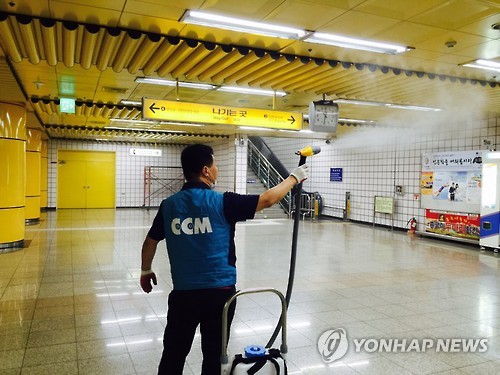 | △ 대구지하철 메르스 방역 '혼신' (대구=연합뉴스) 김용민 기자 = 대구도시철도공사 직원이 18일 낮 지하철 역사에서 방역 작업을 벌이고 있다. 공사는 최근 대구에서 확진 환자가 나오면서 역 시설물 소독을 한층 강화하는 등 메르스 확산 방지에 혼신을 쏟고 있다. 2015.6.18 yongmin@yna.co.kr |