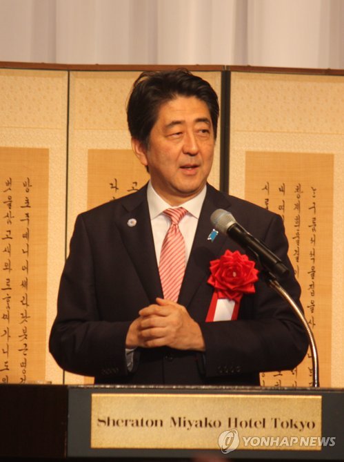 | △ 한일수교 50주년 도쿄 행사서 축사하는 아베 총리 (도쿄=연합뉴스) 조준형 특파원 = 아베 신조(安倍晋三) 일본 총리가 22일 오후 도쿄 도내 쉐라톤 미야코 호텔에서 주일 한국대사관 주최로 열린 한일 국교정상화 50주년 기념 리셉션에 참석해 축사를 하고 있다. 2015.6.22 jhcho@yna.co.kr |