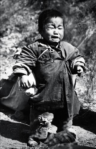 1951년 2월 홍천에서 촬영된 이 사진은 전쟁의 비극이 이렇게 어린 아이에게까지 엄청난 고통을 주고 있음을 상징적으로 보여주고 있다.