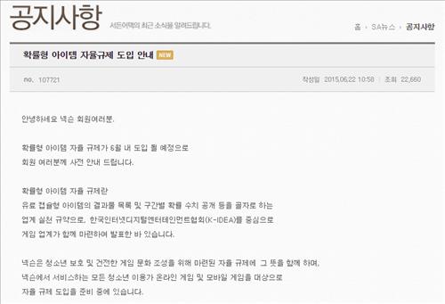가장 먼저 나선 업체는 국내 업계 1위인 넥슨이다. 넥슨은 전날 공지사항을 통해 "넥슨 및 관계사들이 서비스하는 게임들은 30일까지 차례로 자율규제를 적용할 예정"이라고 밝혔다.
