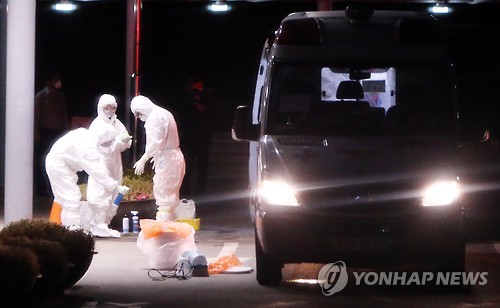 | △ 소독 철저 (파주=연합뉴스) 노승혁 기자 = 중동호흡기증후군(메르스) 확진판정을 받은 서울 주민 한명이 최근 경기도 구리의 카이저 병원 등 2곳을 들렀던 것이 확인되면서 경기도 보건당국에 비상이 걸렸다. 경기도는 22일 확진가능성이 있는 이들병원 110여명의 환자들중 17명을 경기도의료원 파주병원에 이송하고 34명은 23일 이송키로 했다. 이날 늦은 밤 카이저재활병원 환자들을 파주병원에 이송한 경기북부소방본부 구조구급팀원들이 소독을 하고 있다. 2015.6.23 nsh@yna.co.kr |
