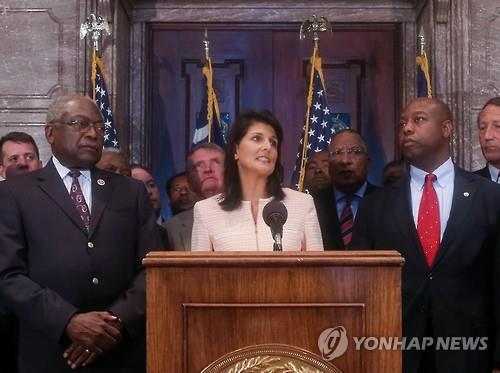AP, AFP통신 등 현지언론에 따르면 공화당원인 헤일리 주지사는 이날 민주, 공화당 의원들의 초당적 지지를 받으며 기자회견을 열었다.