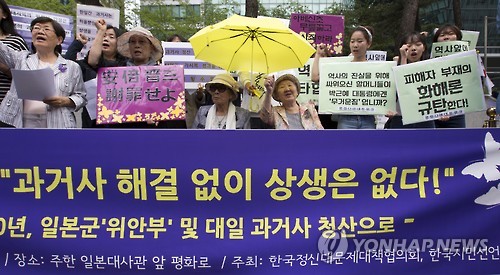| △ '과거사 해결없이 상생은 없다' (서울=연합뉴스) 윤동진 기자 = 23일 오후 서울 종로구 주한일본대사관 앞에서 열린 '한국정신대문제대책협의회, 긴급 기자회견'에서 김복동(앞줄 왼쪽 네 번째), 길원옥 할머니 등 참석자들이 일본군 위안부 및 대일 과거사 청산을 촉구하는 구호를 외치고 있다. 2015.6.23 mon@yna.co.kr |