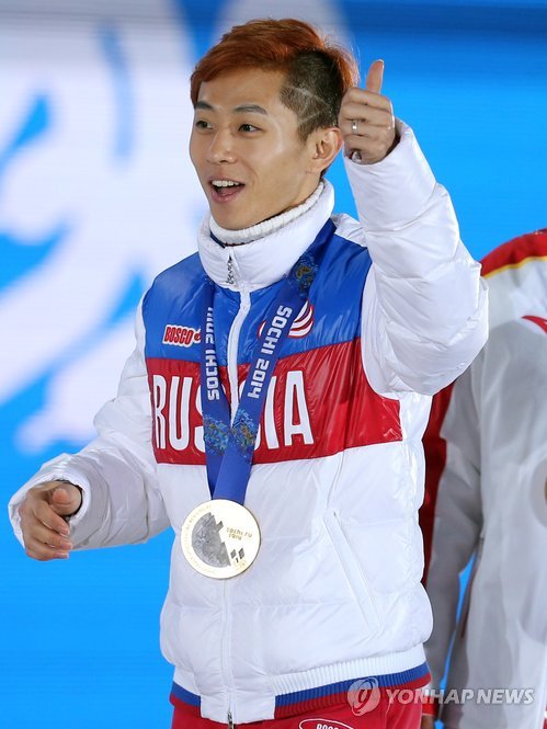 | △ <올림픽> 엄지 치켜세우는 빅토르 안 (소치=연합뉴스) 임헌정 기자 = 2014 소치 동계올림픽 쇼트트랙 남자 5,000m 계주에서 금메달을 따낸 러시아의 빅트로 안(한국명 안현수)이 23일 오전(한국시간) 러시아 소치 올림픽파크 메달플라자에서 열린 시상식이 끝난 뒤 엄지손가락을 치켜세우고 있다. 2014.2.23 kane@yna.co.kr |