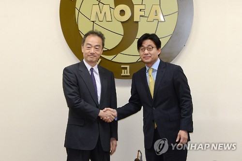 | △ 지난 9일 서울 종로구 도렴동 외교부 청사에서 최종문 유네스코 협력대표(오른쪽)가 일제 강점기 조선인 강제노동 시설이 포함된 일본 근대산업시설의 세계유산 등재 추진을 놓고 신미 준(新美潤) 외무성 국제문화교류심의관 겸 스포츠담당대사와 한일 2차 양자 협의에 앞서 악수를 하고 있다. |