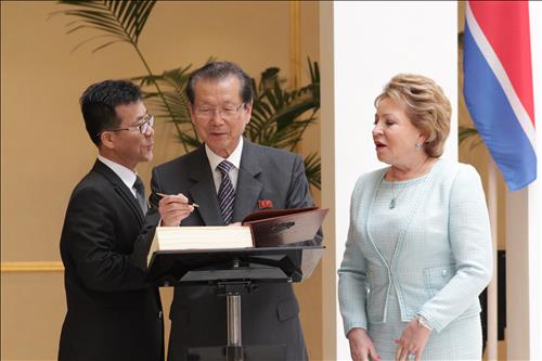 최 의장은 방문록에 '로씨야(러시아) 인민에게 번영과 복리가 있기를 축원합니다'란 문구를 남기고 곧바로 회의실로 이동했고 뒤이어 양국 의원 대표단은 약 1시간 동안 회담했다.