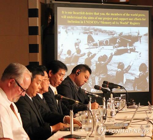 | △ 시모이데 간페이(霜出勘平, 왼쪽에서 세 번째) 일본 미나미큐슈(南九州) 시장 등이 2015년 5월 13일 오후 일본 도쿄도 소재 외국특파원협회에서 기자회견을 하는 가운데 일본군 전투기를 향해 여성들이 꽃을 흔드는 사진이 선보이고 있다. 당시 시모이데 시장은 이른바 '가미카제(神風) 자살특공대'로 알려진 태평양 전쟁 말기 일본군 특공대원의 유서 등이 세계기록유산에 등재되도록 추진하겠다는 구상을 밝혔다.(연합뉴스 자료사진) |