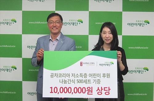 (서울=연합뉴스) 이도연 기자 = 공차코리아는 저소득층 어린이들을 위해 초록우산어린이재단 서울남부지역본부에 간식을 기증했다고 24일 밝혔다.
