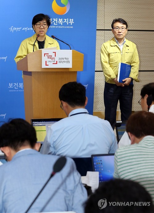 | △ '현재 메르스 환자 현황은' (세종=연합뉴스) 배재만 기자 = 정은경 중앙메르스대책본부 현장점검반장이 24일 오전 정부세종청사 보건복지부 공용브리핑룸에서 열린 정례브리핑에서 중동호흡기증후군(메르스) 환자 현황에 대해 브리핑하고 있다. 오른쪽은 권덕철 총괄반장. 2015.6.24 scoop@yna.co.kr http://blog.yonhapnews.co.kr/f6464 |