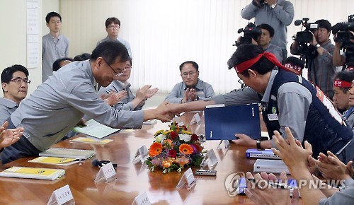 | △ 악수하는 현대중공업 노사 (울산=연합뉴스) 김용태 기자 = 25일 오후 울산 현대중공업 본사에서 열린 올해 첫 임금협상에서 노사 교섭대표들이 악수하고 있다. 2015.6.25 yongtae@yna.co.kr |