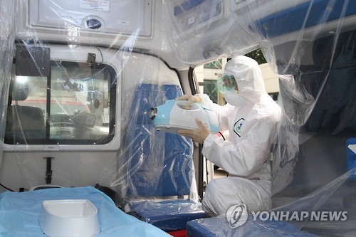 | △ 구급차 소독하는 구급대원 (서울=연합뉴스) 강동소방서 메르스 전담 119구급대원이 24일 서울 강동소방서에서 구급차량을 소독하고 있다. |
