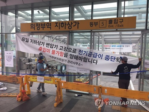 | △ 의정부역 지하상가 출입통제 (의정부=연합뉴스) 권숙희 기자 = 25일 경기도 의정부역 지하상가 배전실에서 침수 사고가 나 상가점포에 출입이 전면 통제되고 있다. 2015.6.25 suki@yna.co.kr |
