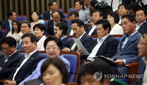 | △ (서울=연합뉴스) 도광환 기자 = 25일 오후 국회에서 열린 새누리당 의원총회에서 총회장에 참석한 의원들이 굳은 표정으로 자리에 앉아 있다. |