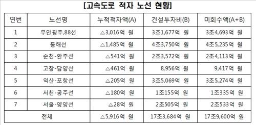 이들 7개 노선의 누적 적자액은 5천916억원, 건설투자비는 17조3천684억원으로 두 금액을 더한 미회수액은 18조원에 육박한다.