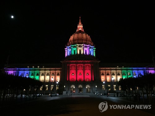 선고 전날인 25일 밤 샌프란시스코 시 청사와 전쟁기념 오페라하우스 등 주요 공공건물에는 리 시장의 지시에 따라 '빨주노초파남보'의 무지개빛 조명이 환하게 켜졌다.