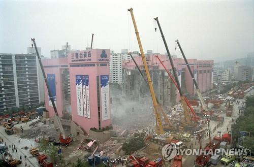 | △ (서울=연합뉴스) 6월 29일은 서울 강남 한복판의 삼풍백화점이 순식간에 무너진 지 20년이 되는 날이다. 502명의 목숨을 앗아가 건국 이래 최대 참사로 기록된 삼풍백화점 붕괴사고는 우리 사회의 안전불감증과 부패의 대가가 얼마나 참혹할 수 있는지를 보여줬다. 사진은 1995년 6월30일 삼풍백화점 붕괴사고 이틀째 합동구조반이 대형 기중기를 동원, 잔해 철거작업을 벌이고 있는 모습. 2015.6.28 <<연합뉴스DB>> photo@yna.co.kr (끝) |